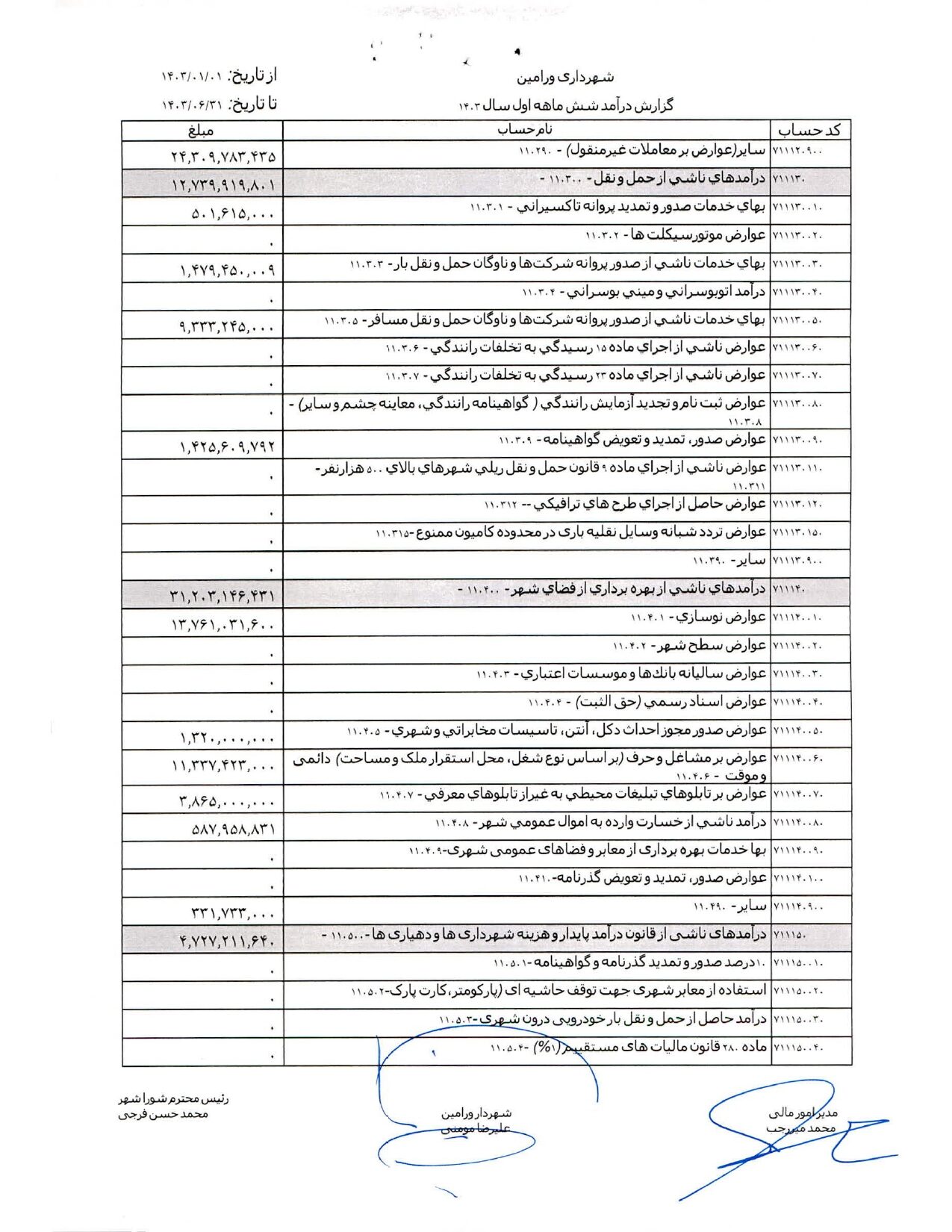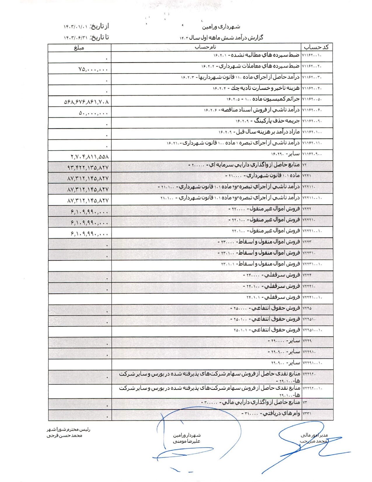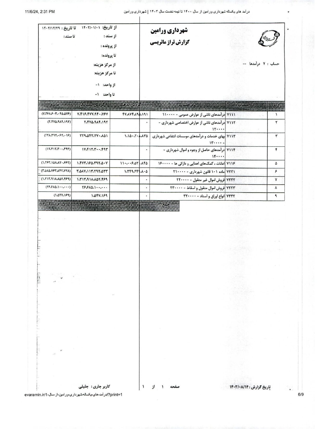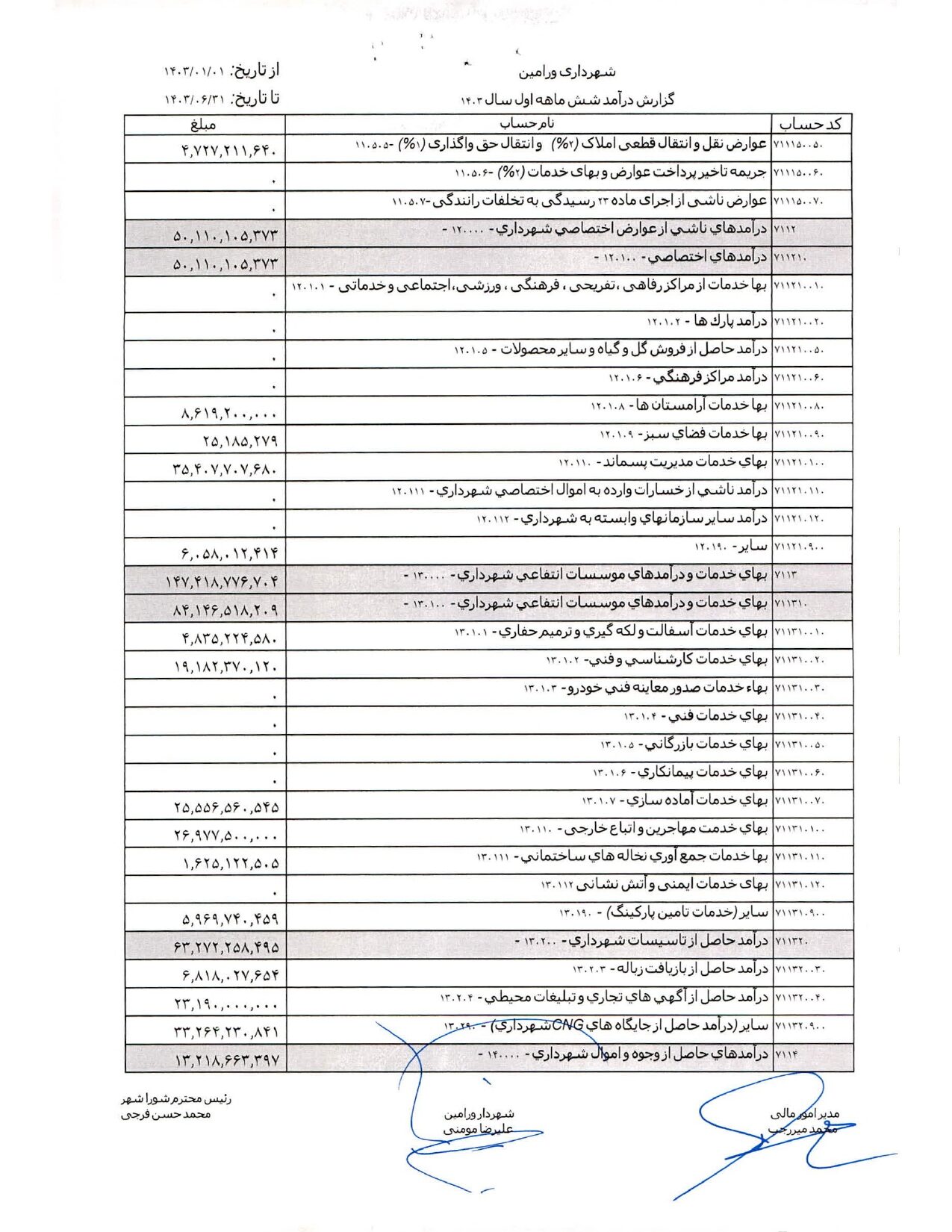 صورت جامع درآمد و هزینه شهرداری در شش ماهه اول سال 1403