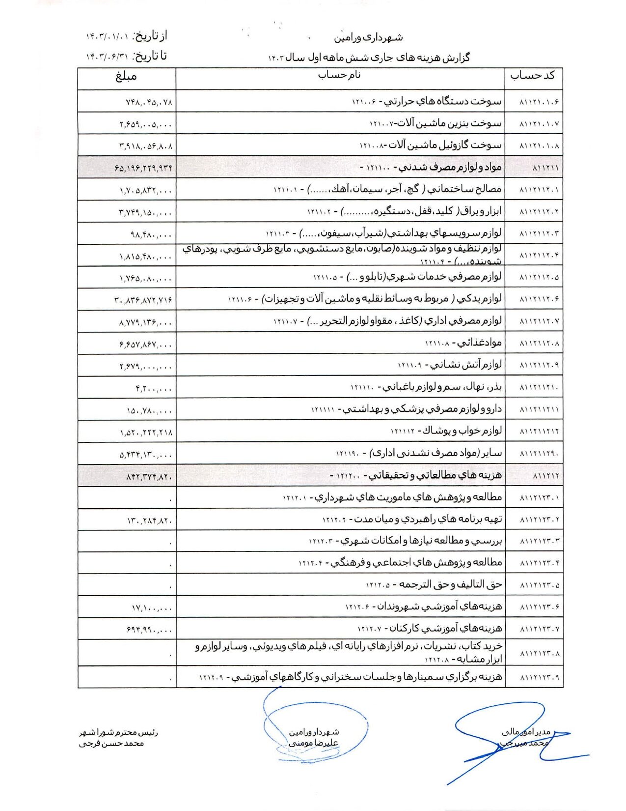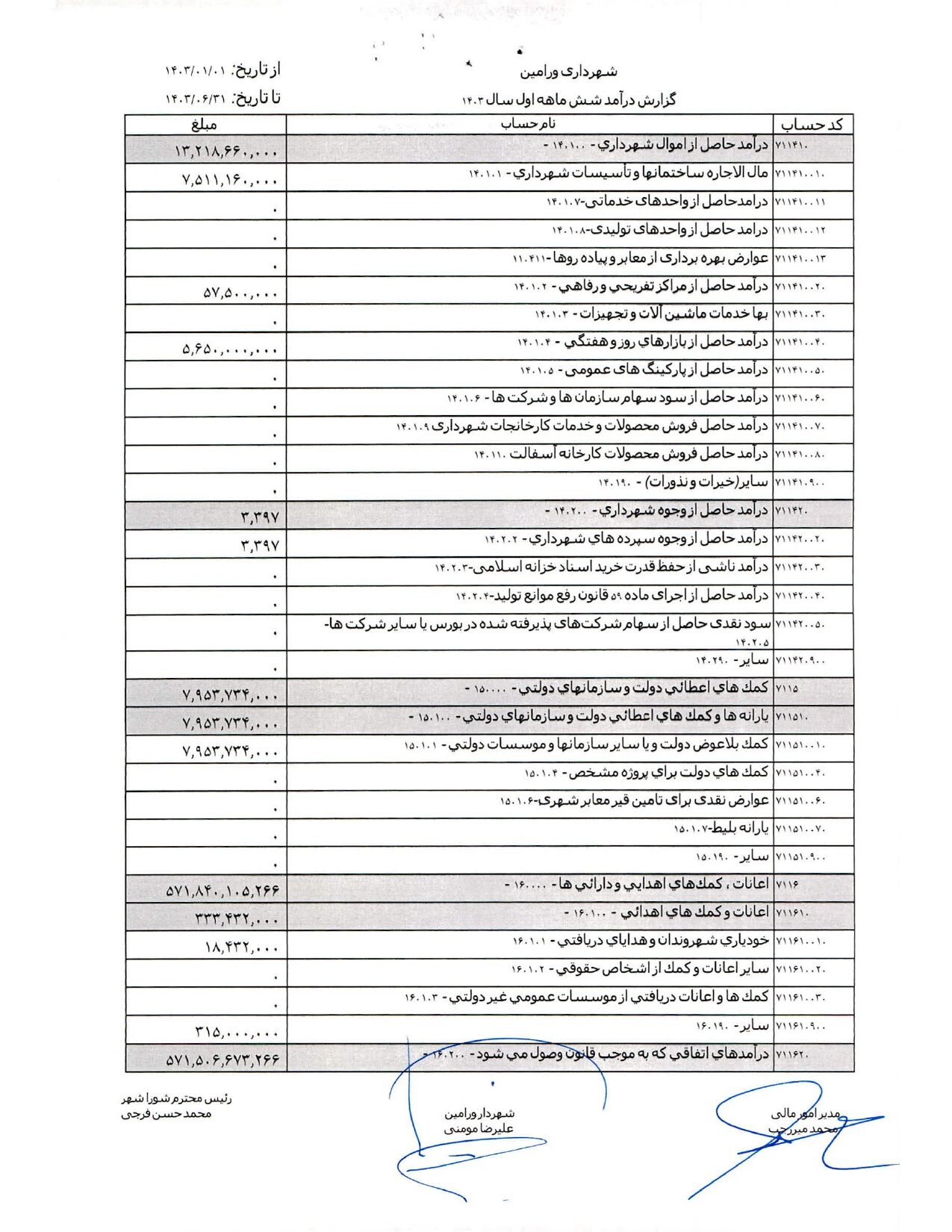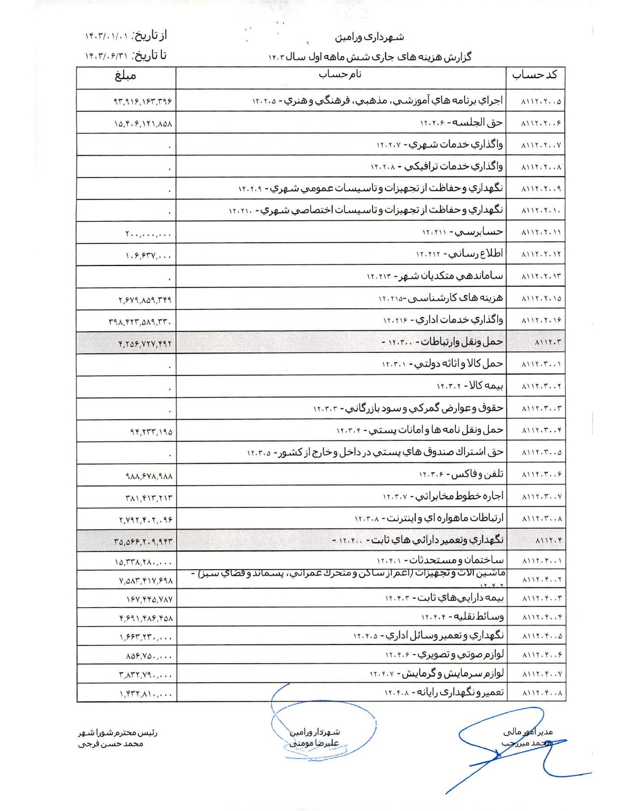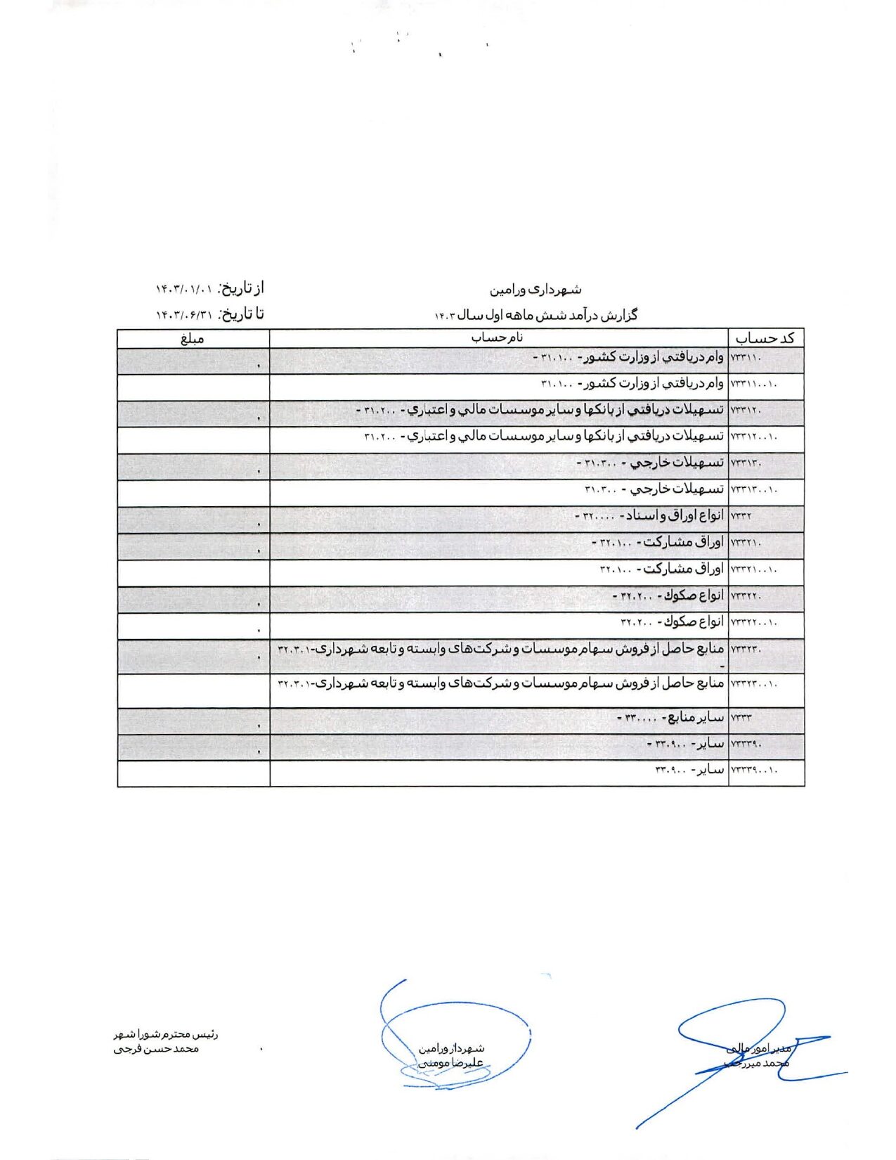 صورت جامع درآمد و هزینه شهرداری در شش ماهه اول سال 1403