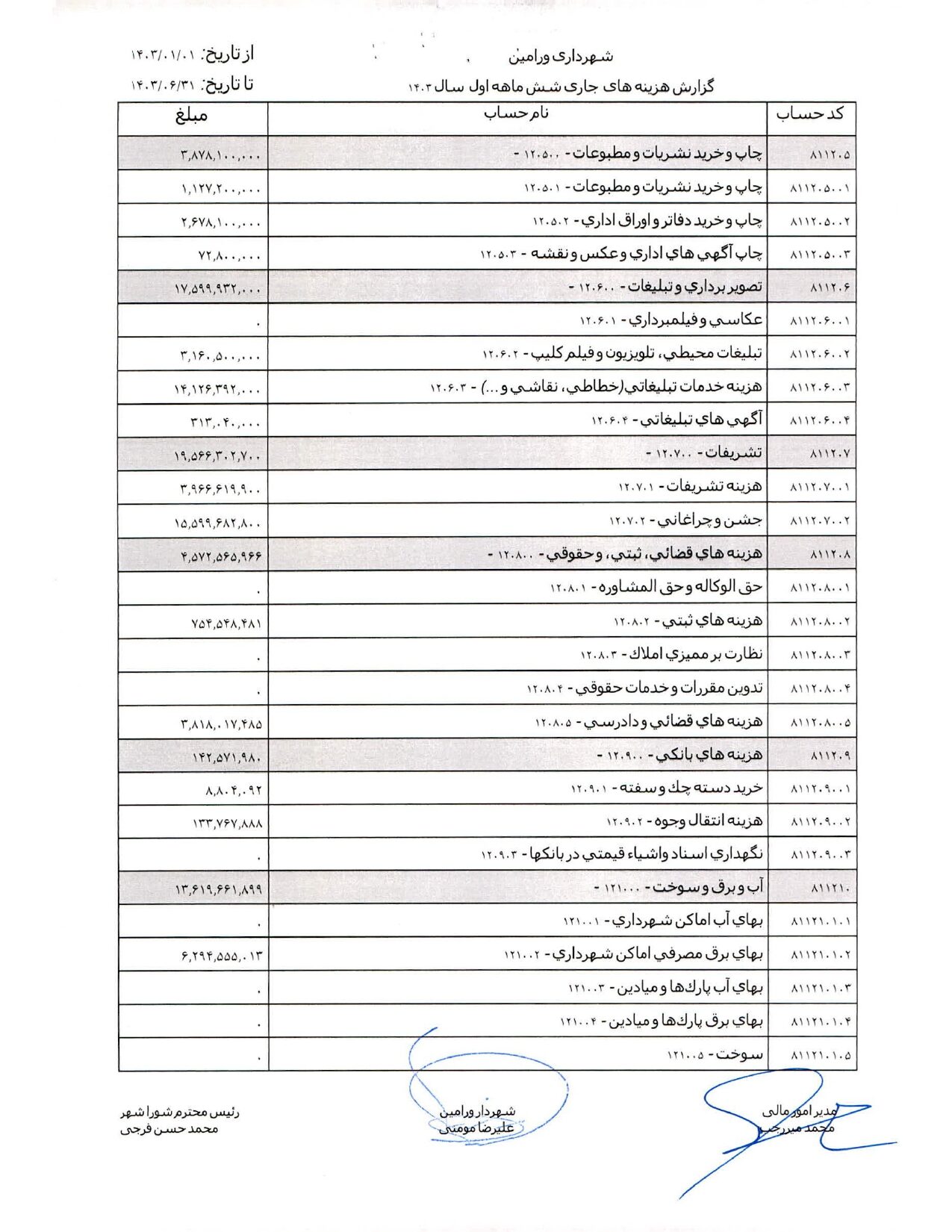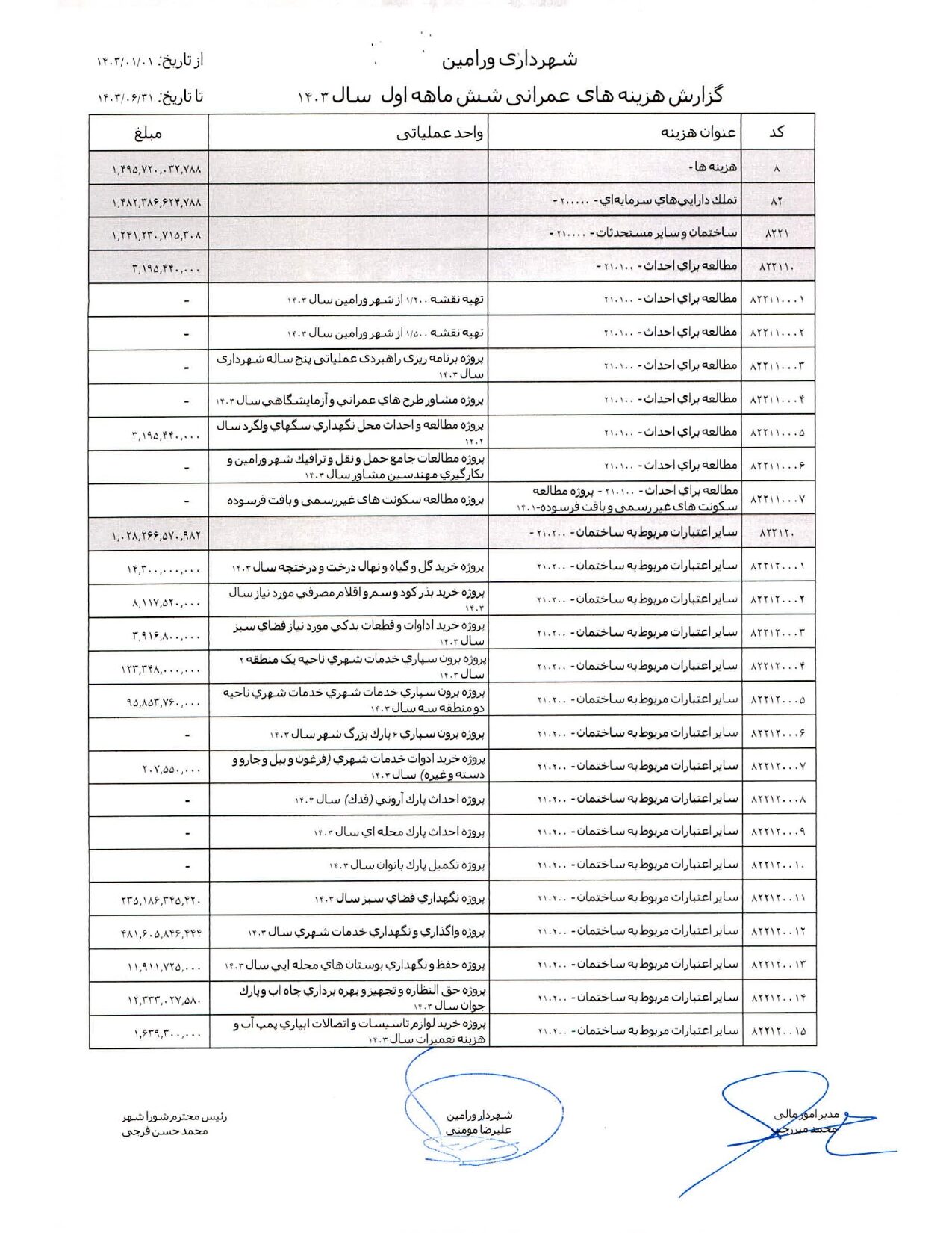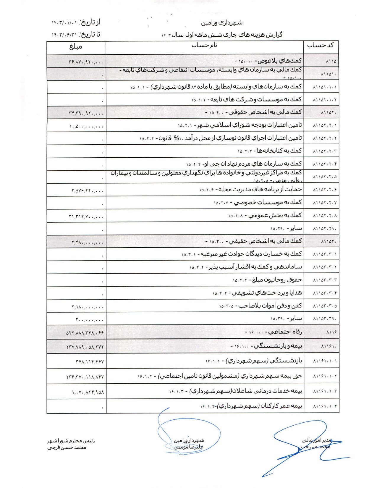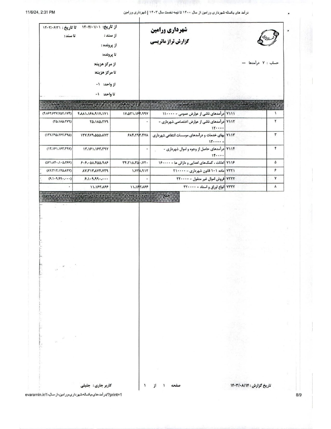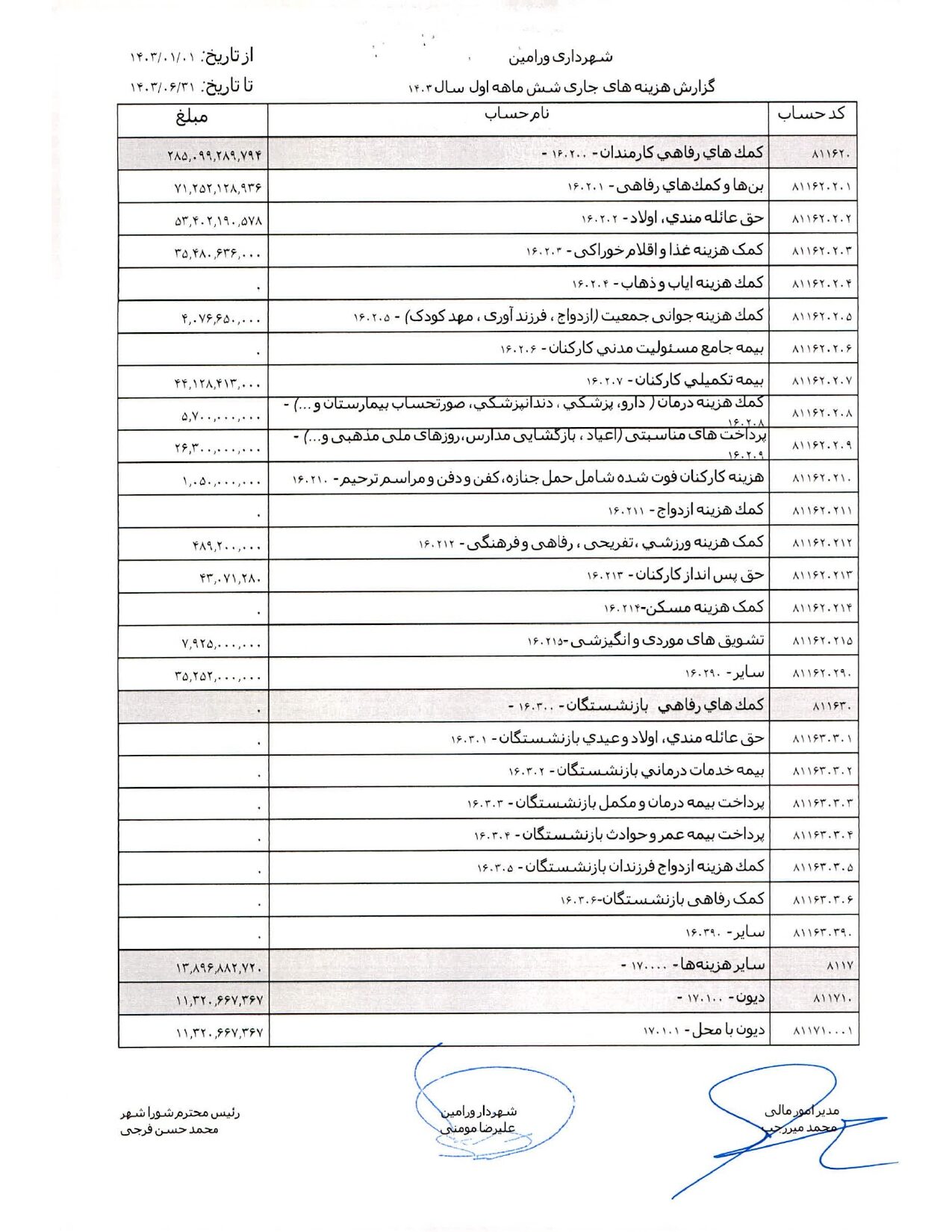 صورت جامع درآمد و هزینه شهرداری در شش ماهه اول سال 1403