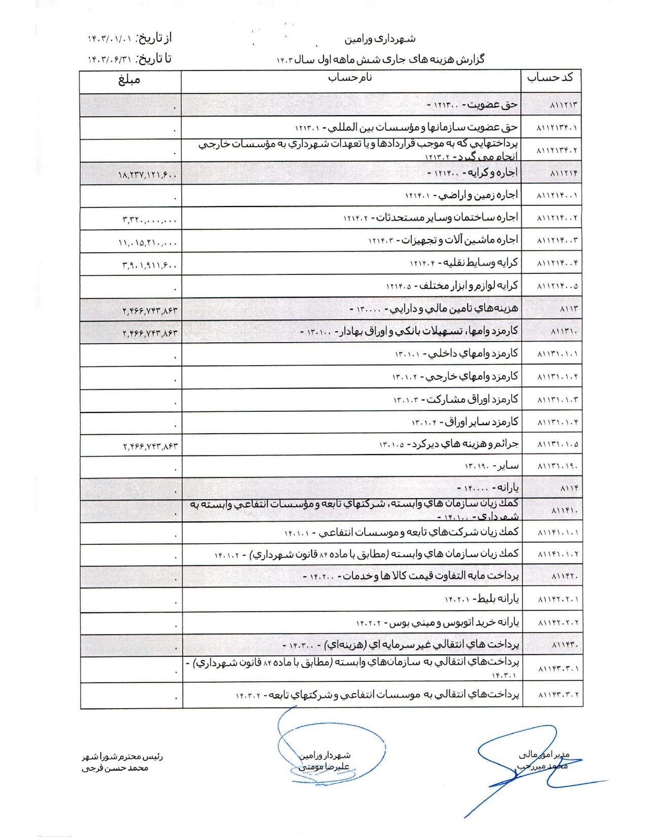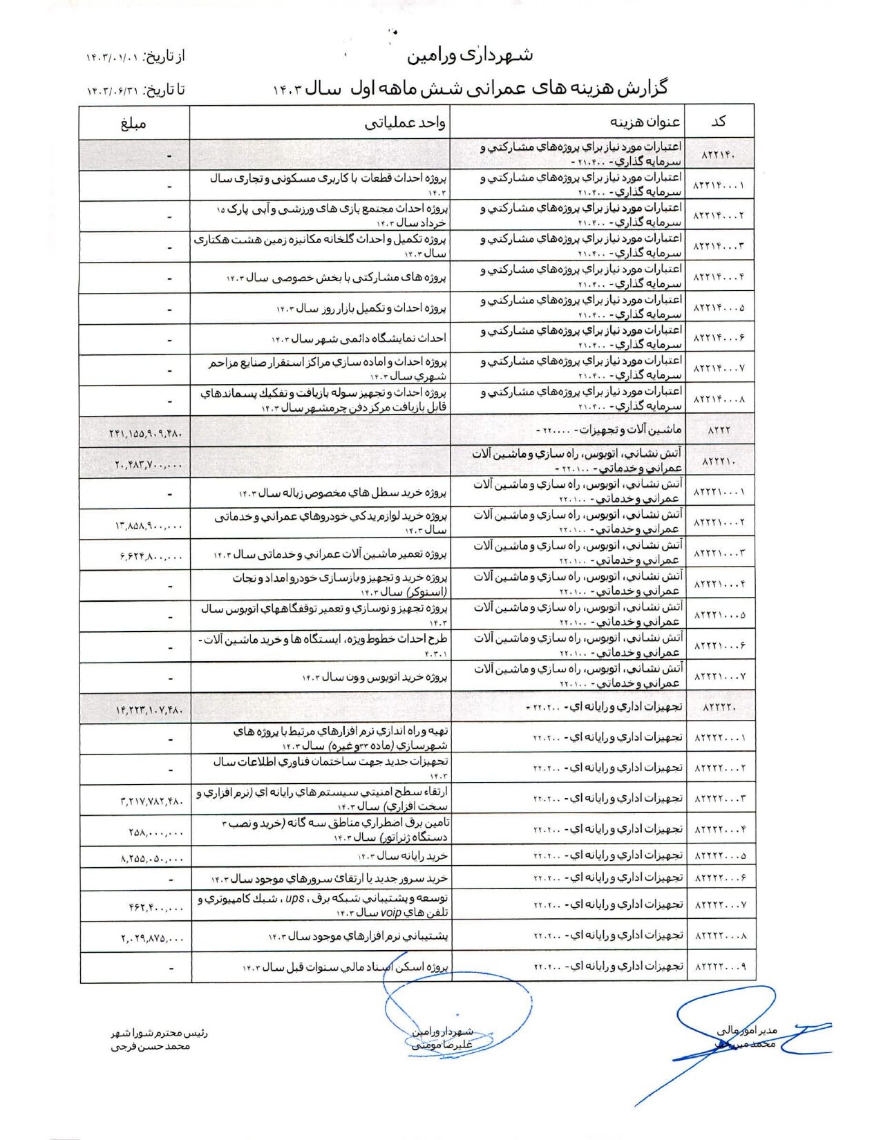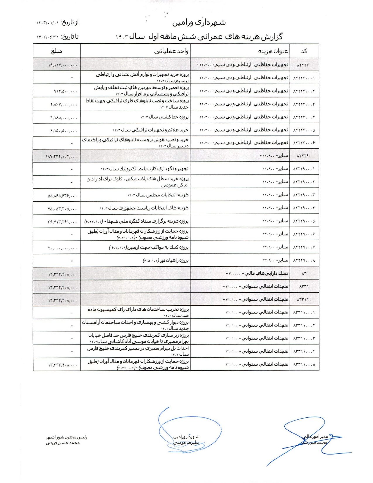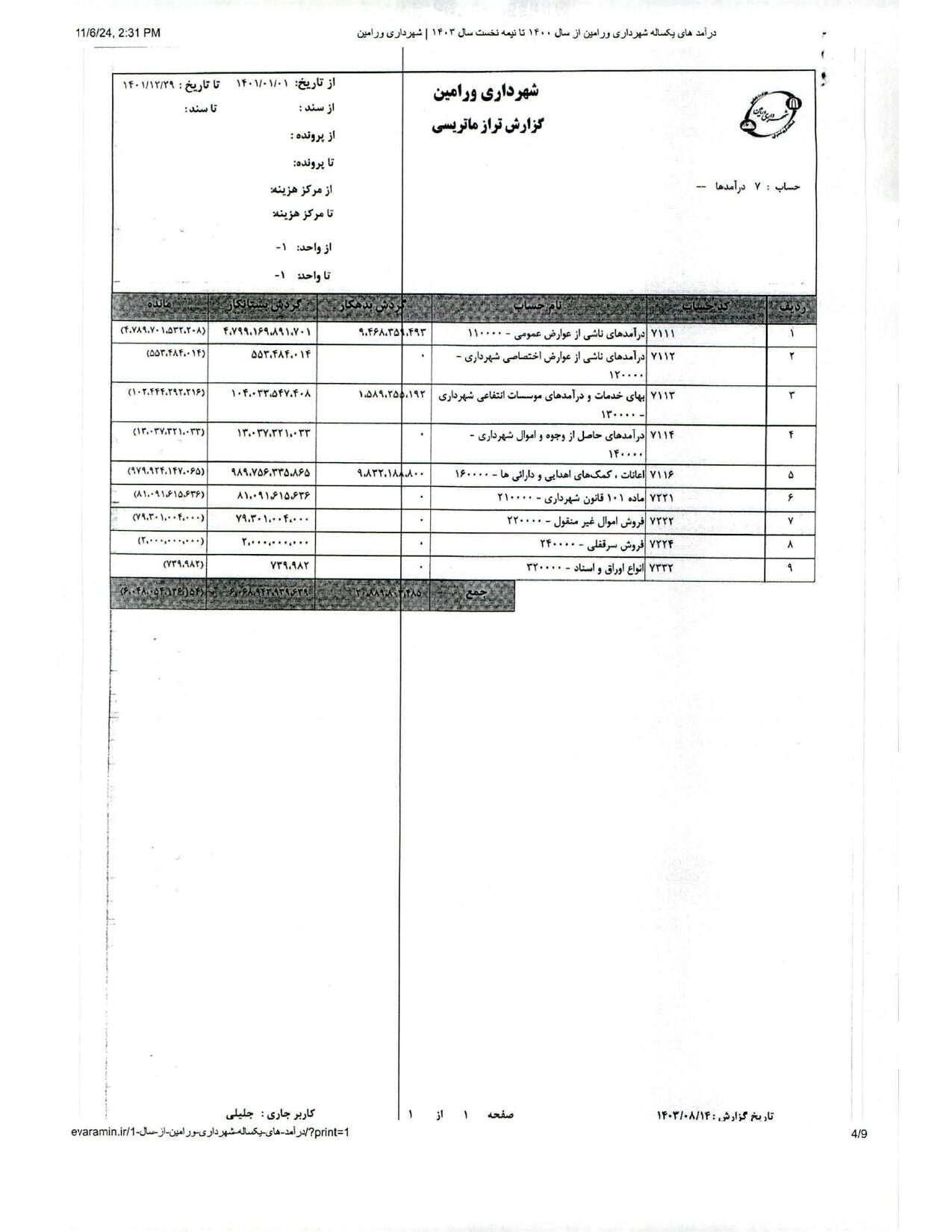 صورت جامع درآمد و هزینه شهرداری در شش ماهه اول سال 1403