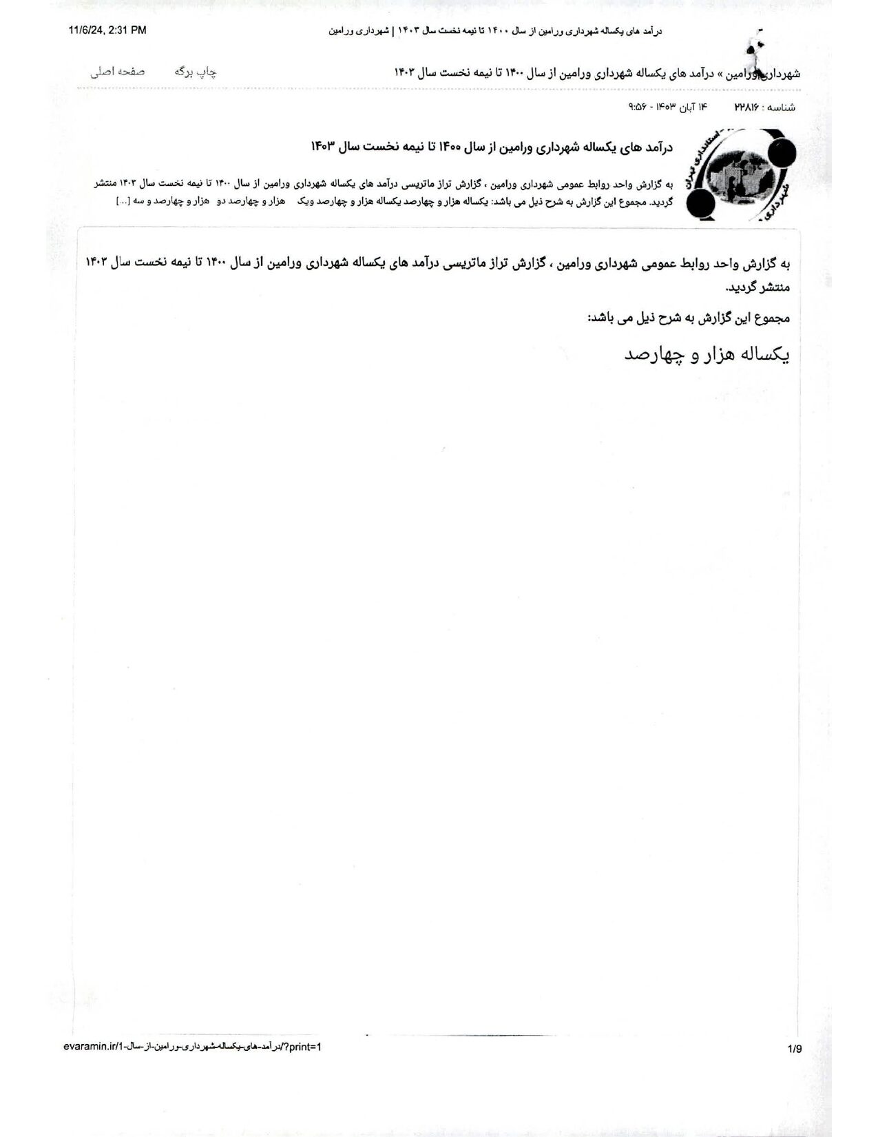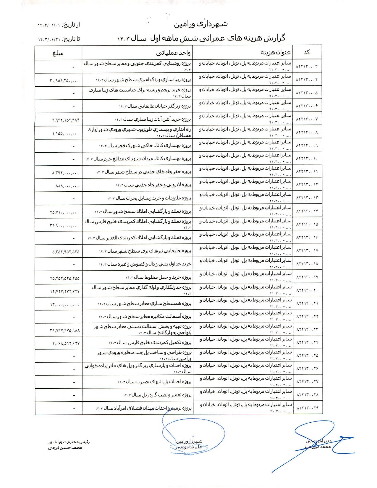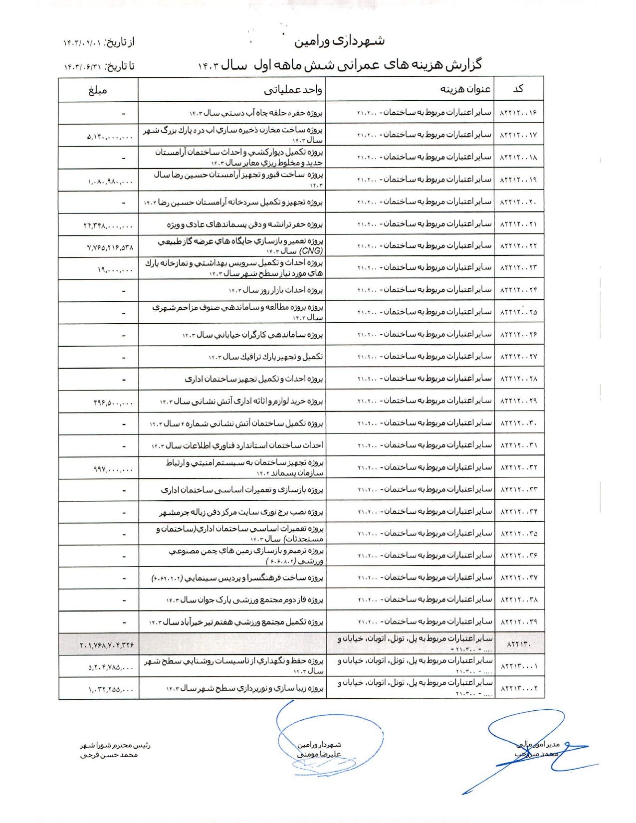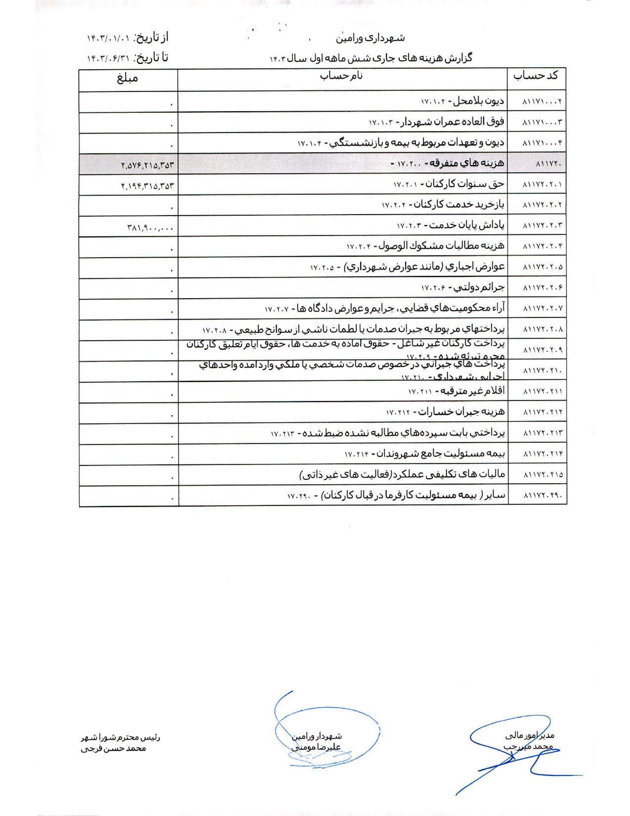 صورت جامع درآمد و هزینه شهرداری در شش ماهه اول سال 1403