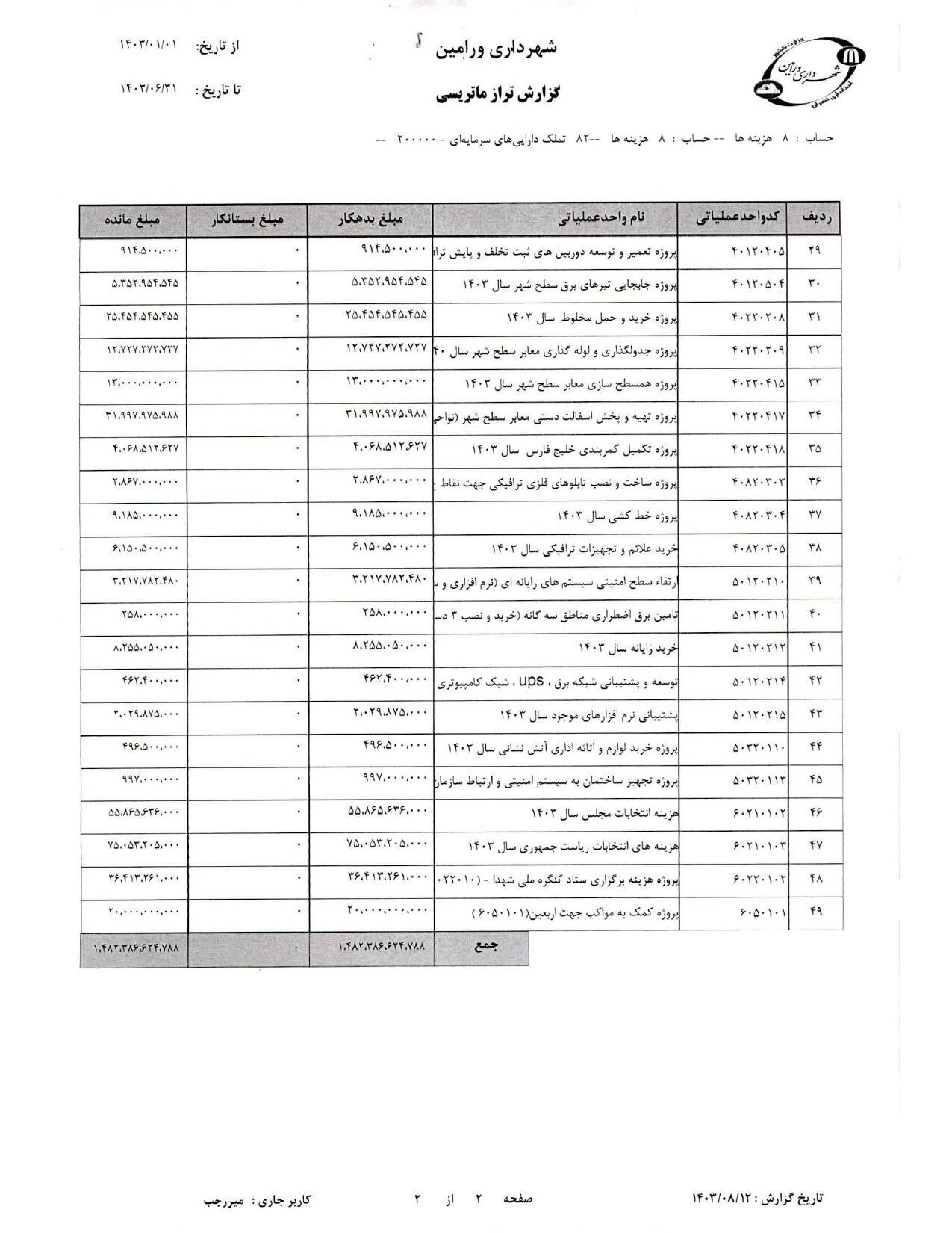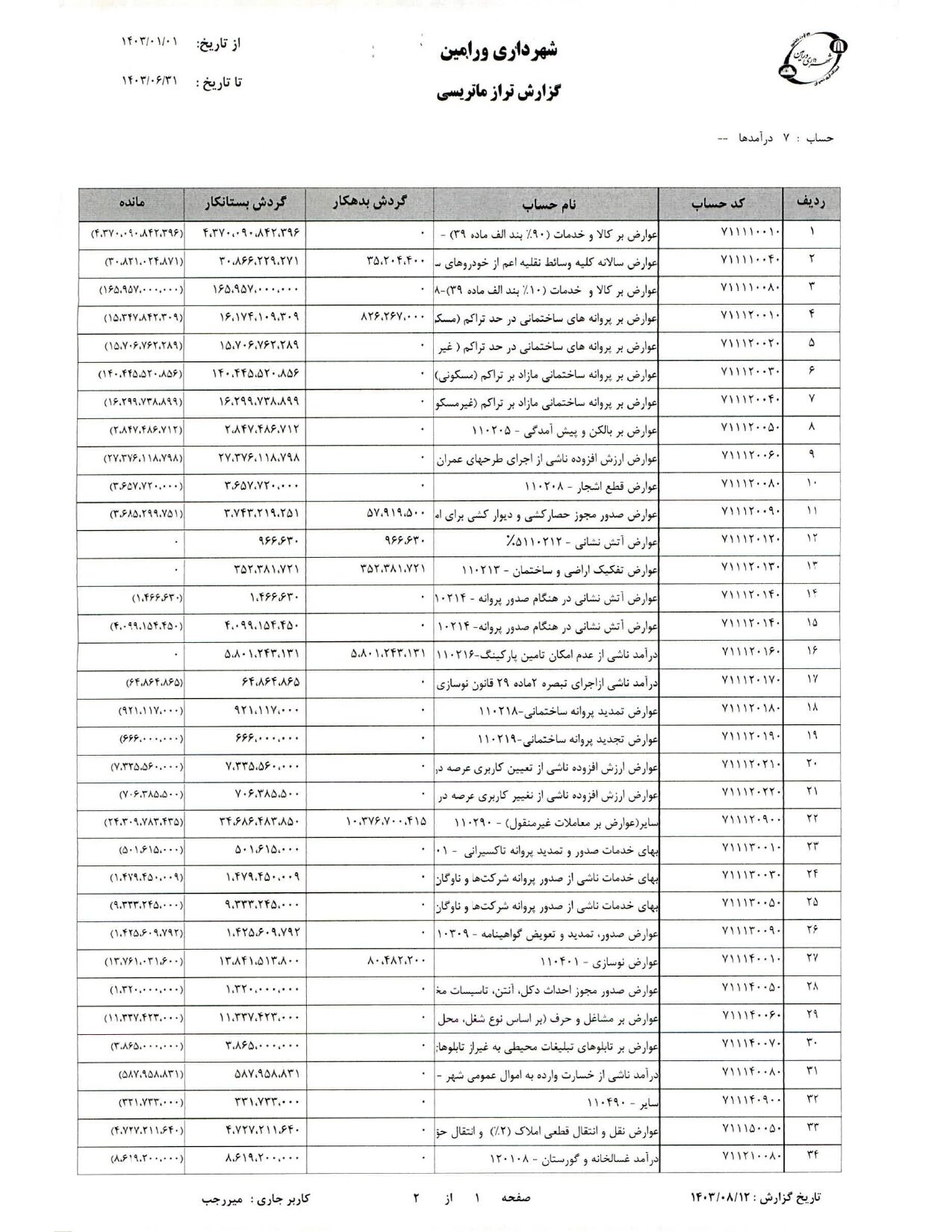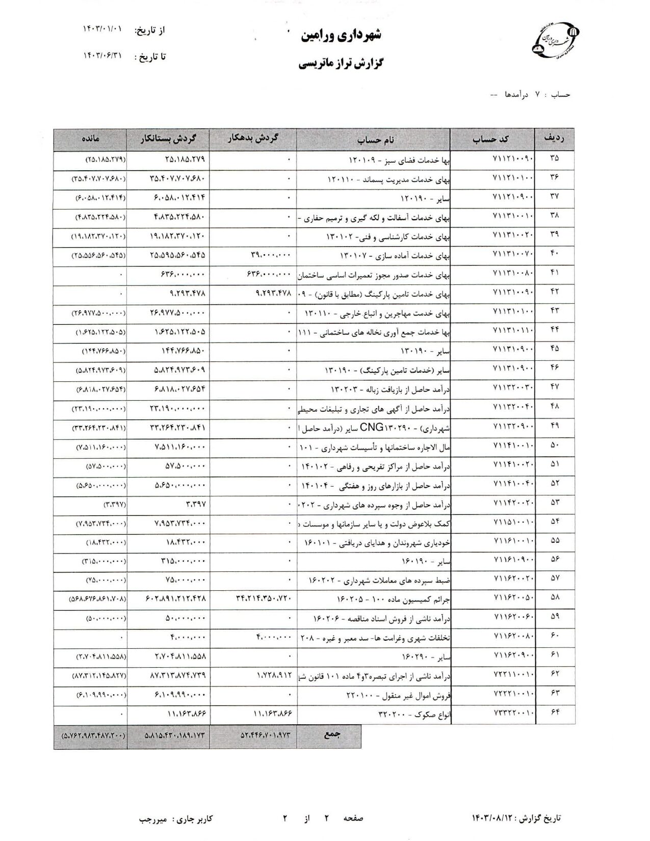 صورت جامع درآمد و هزینه شهرداری در شش ماهه دوم سال 1403