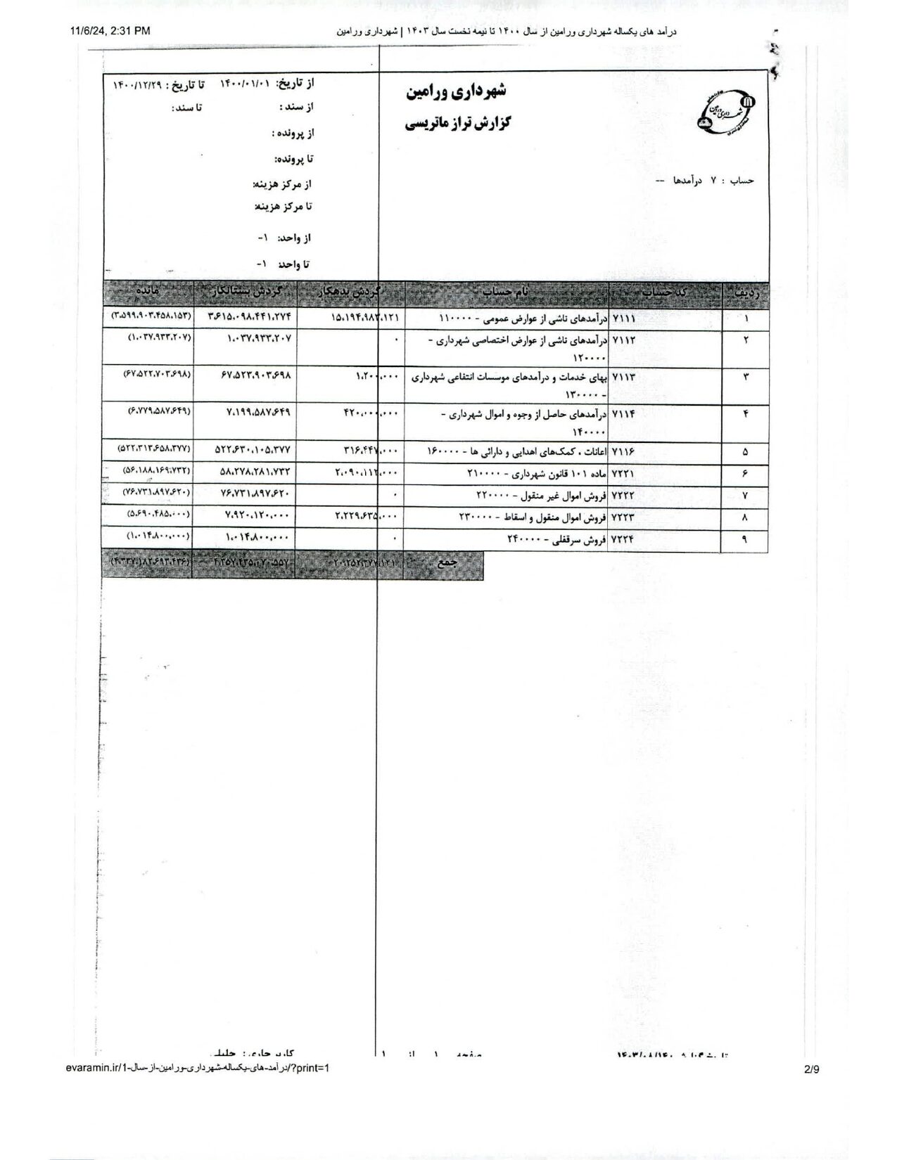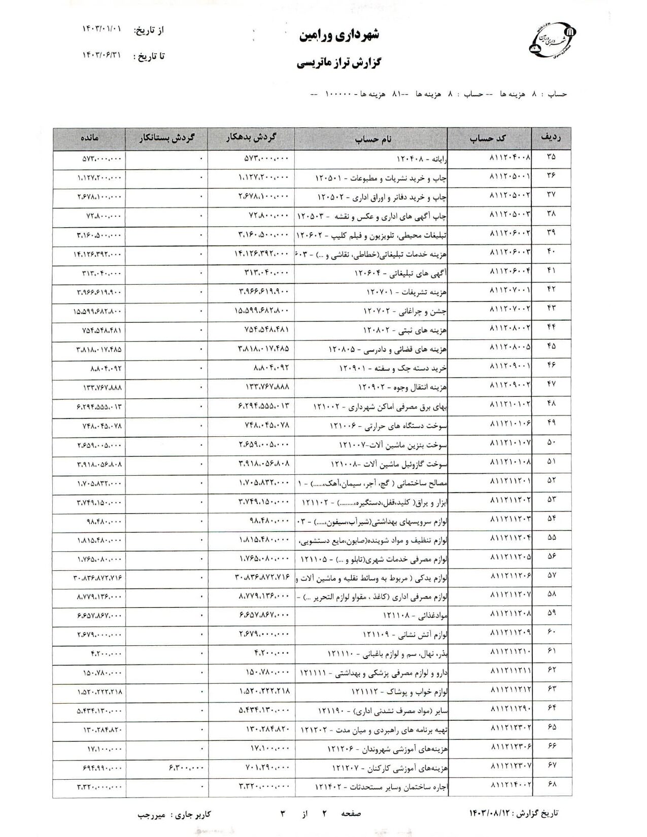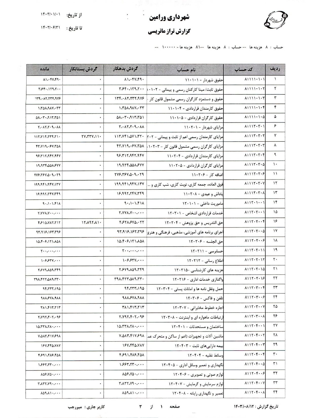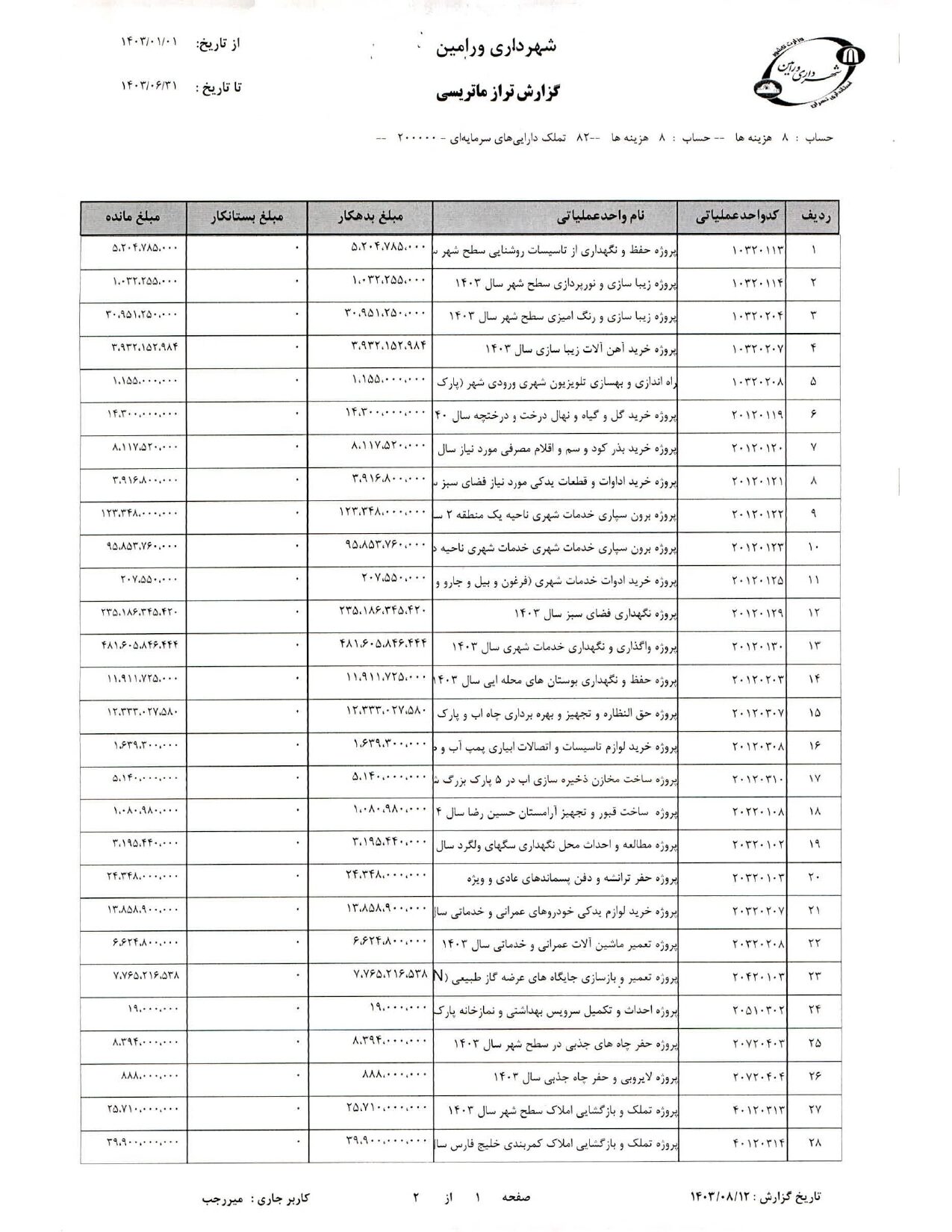 صورت جامع درآمد و هزینه شهرداری در شش ماهه دوم سال 1403